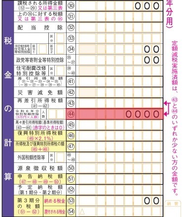 右側の【税金の計算】欄の㊹には令和6年分特別税額控除(3万円×人数)という項目があります。